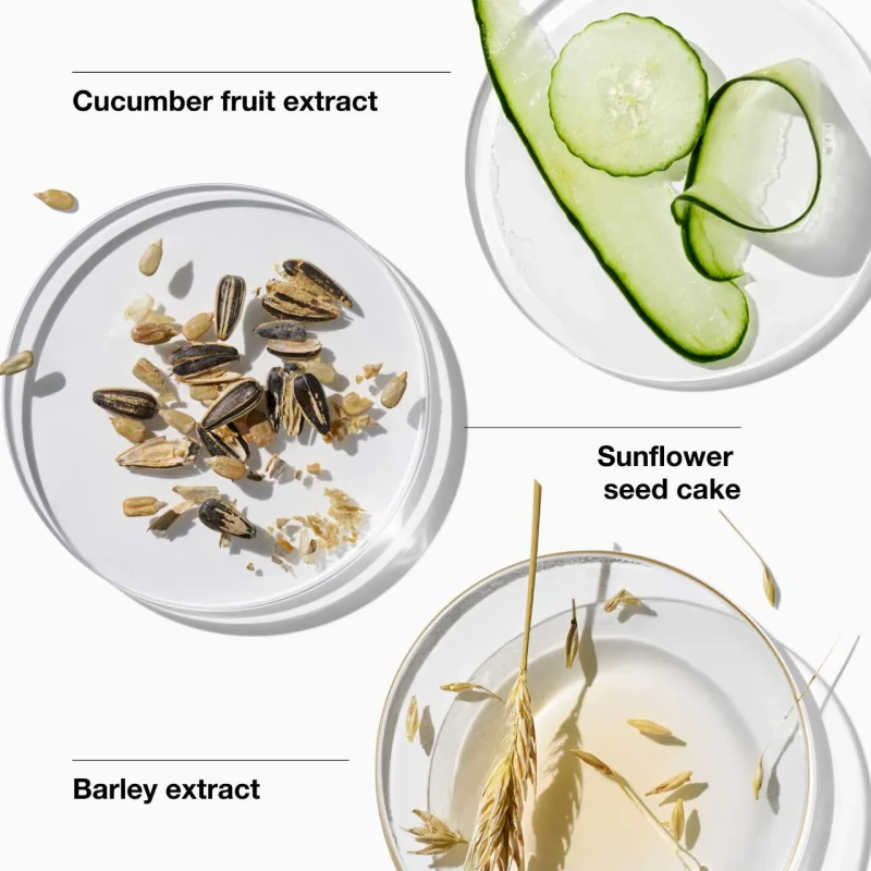 - Sunflower Seed Cake, Barley Extract, and Cucumber Fruit Extract: Help support skin’s barrier, improve its resiliency, and balance and retain skin’s moisture levels.
