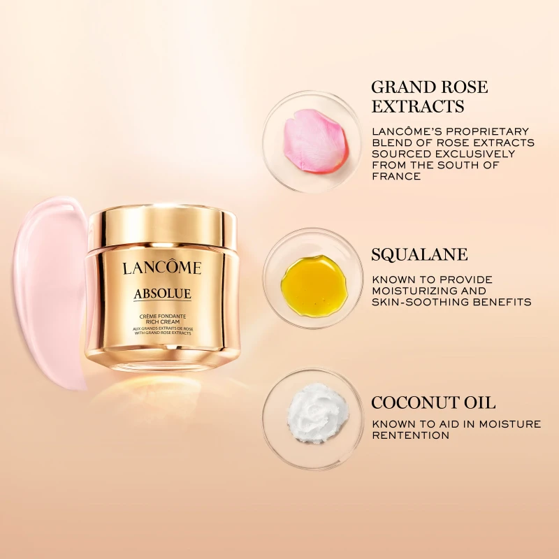 One of Lancôme's most luxuriously hydrating moisturizers, Absolue Rich Cream is a facial moisturizer for dry skin that visibly brightens the skin while reducing the appearance of fine lines. This cream nourishes skin with up to 24 hours of hydration, while helping to accelerate skin surface cell renewal. Formulated with an exclusive blend of Grand Rose Extracts, Pro-Xylane, coconut oil, and squalane, Absolue Rich Cream leaves skin feeling softer, suppler, and nourished after just one application. Over time, skin looks revitalized, radiant, and more even.