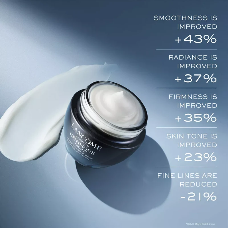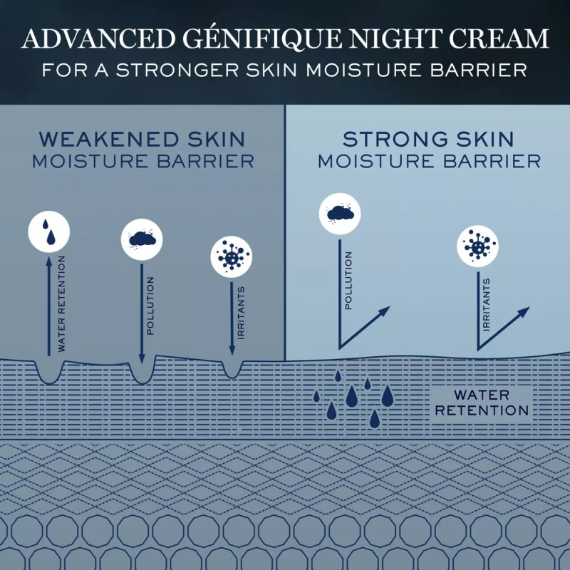 Advanced Génifique Repairing Night Cream* works to restore hydration and plumpness while you sleep to wake up with skin looking radiant and well-rested. In a clinical study, 10 out of 10 of women showed improved radiance***. Over time, this anti-aging cream reduces the appearance of fine lines and wrinkles, to leave skin looking youthful and feeling healthy. Pair with Advanced Génifique Serum to strengthen the skin barrier and follow with the night cream to help repair the skin barrier overnight.